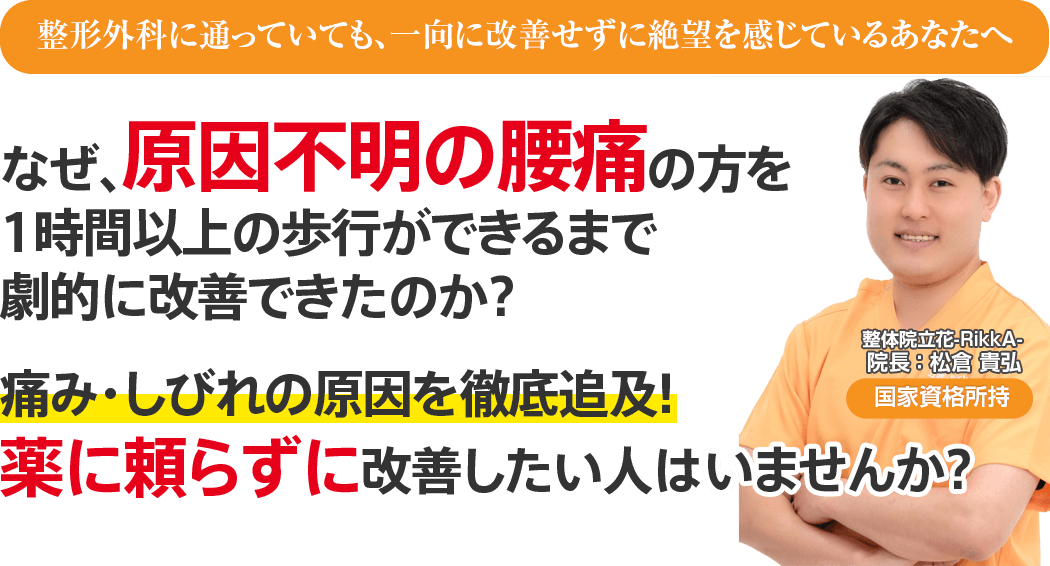 もしあなたが、上記のようにお悩みで、「なにをしても改善しないかもしれない… 」と思われているなら、整体院立花-RikkA-で、その辛い腰痛を根本から改善しませんか?